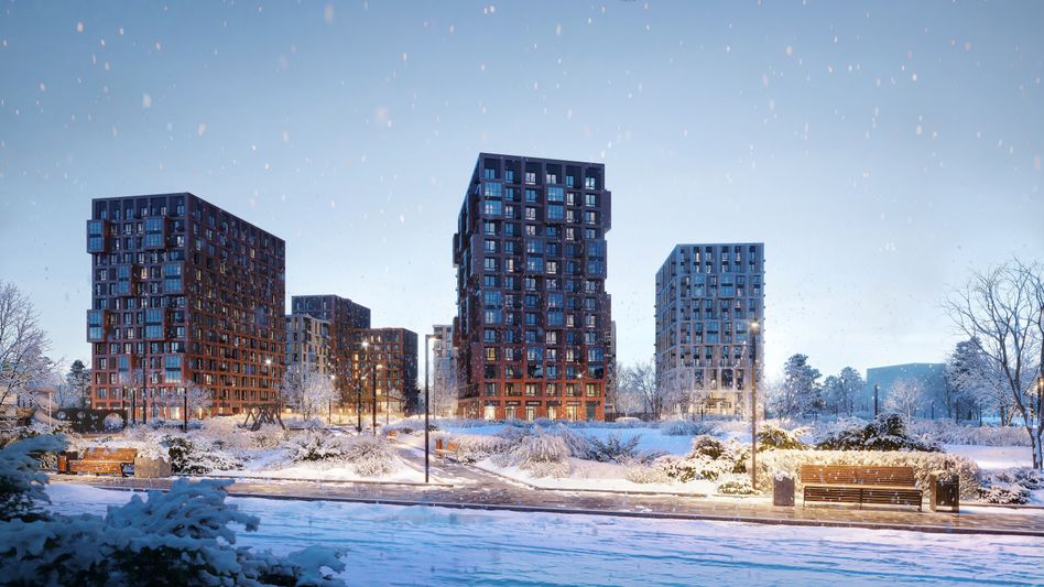 Корпуса высотой 9–12 этажей и 14–17-этажные башни украшают деревянные панели. На фасадах трех башен мы установим динамическую подсветку. На входе в подъезды не будет ступеней и высоких порогов. После прогулки велосипеды и коляски можно оставить в местах хранения.
