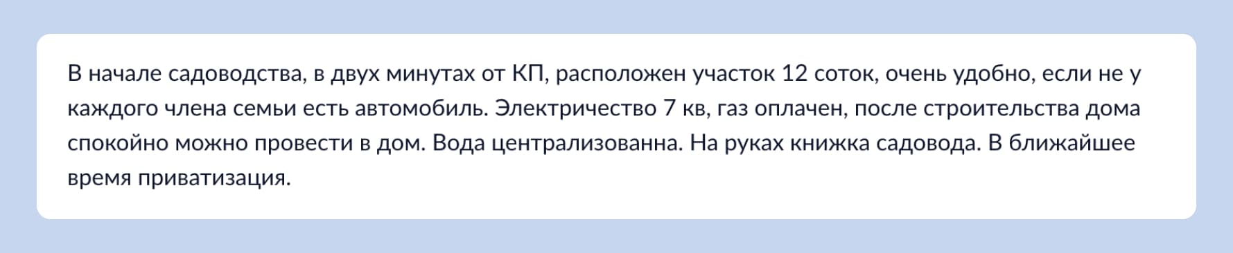 Например, в этом объявлении продавец только собирается приватизировать дачу. Но пока он этого не сделал — покупка не даст вам права собственности