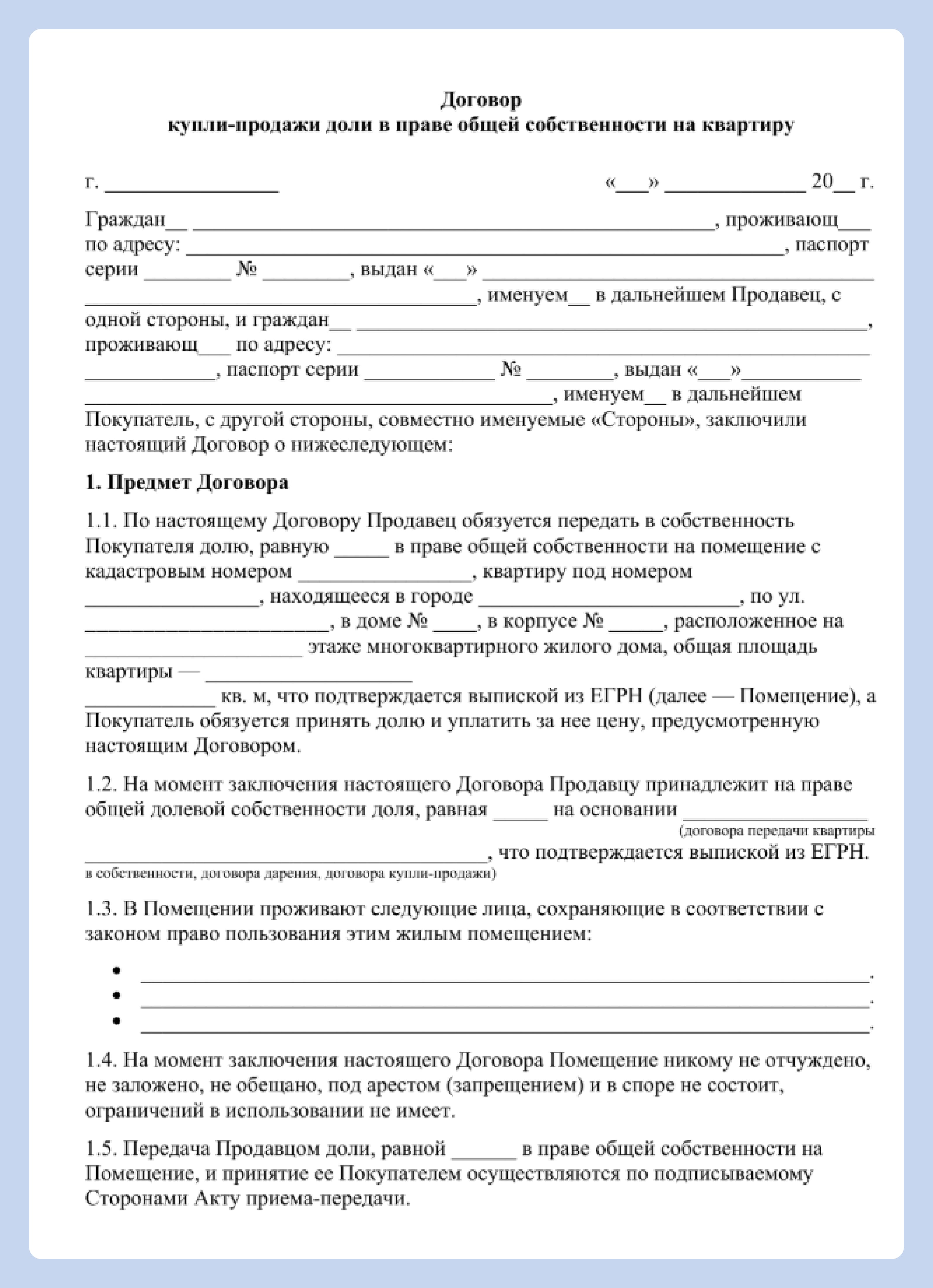 Продать свою часть жилья можно по стандартному договору купли-продажи доли. Такие сделки обязательно заверяются у нотариуса. Источник