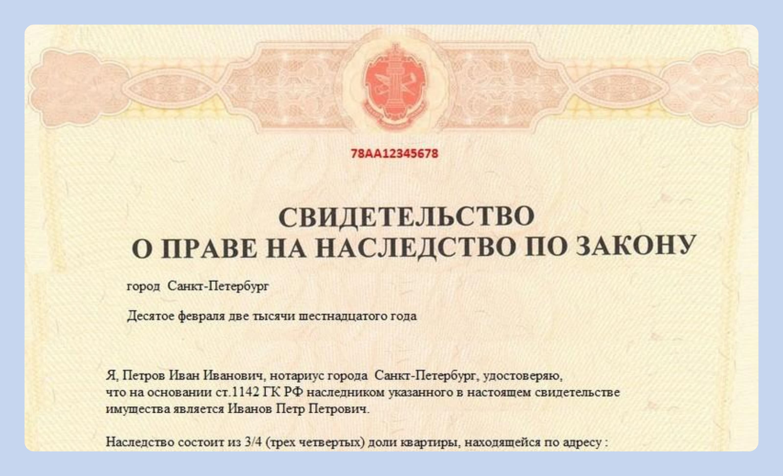 - Получить свидетельство о праве на наследство. Если другие наследники не объявились, имущество передаётся тому, на чьё имя открыто дело.