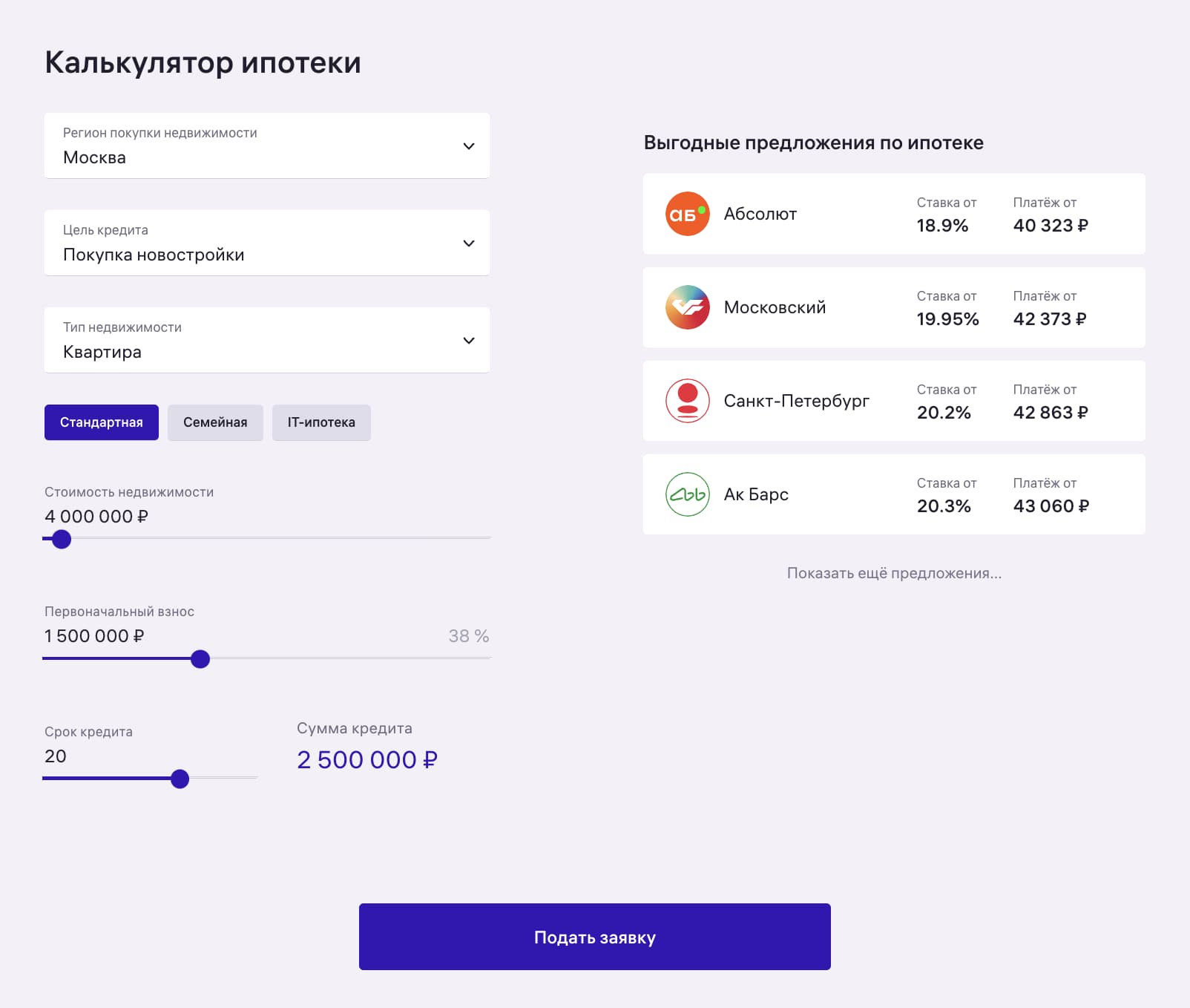 Оформите ипотеку для вашего клиента в сервисе от М2. Введите данные в онлайн‑калькулятор: комфортный платёж, сумму и срок кредита. Мы подберём выгодные предложения от банков-партнёров, а вам останется выбрать подходящие и заполнить единую заявку. Если понадобится помощь, наши менеджеры ответят на любые вопросы.