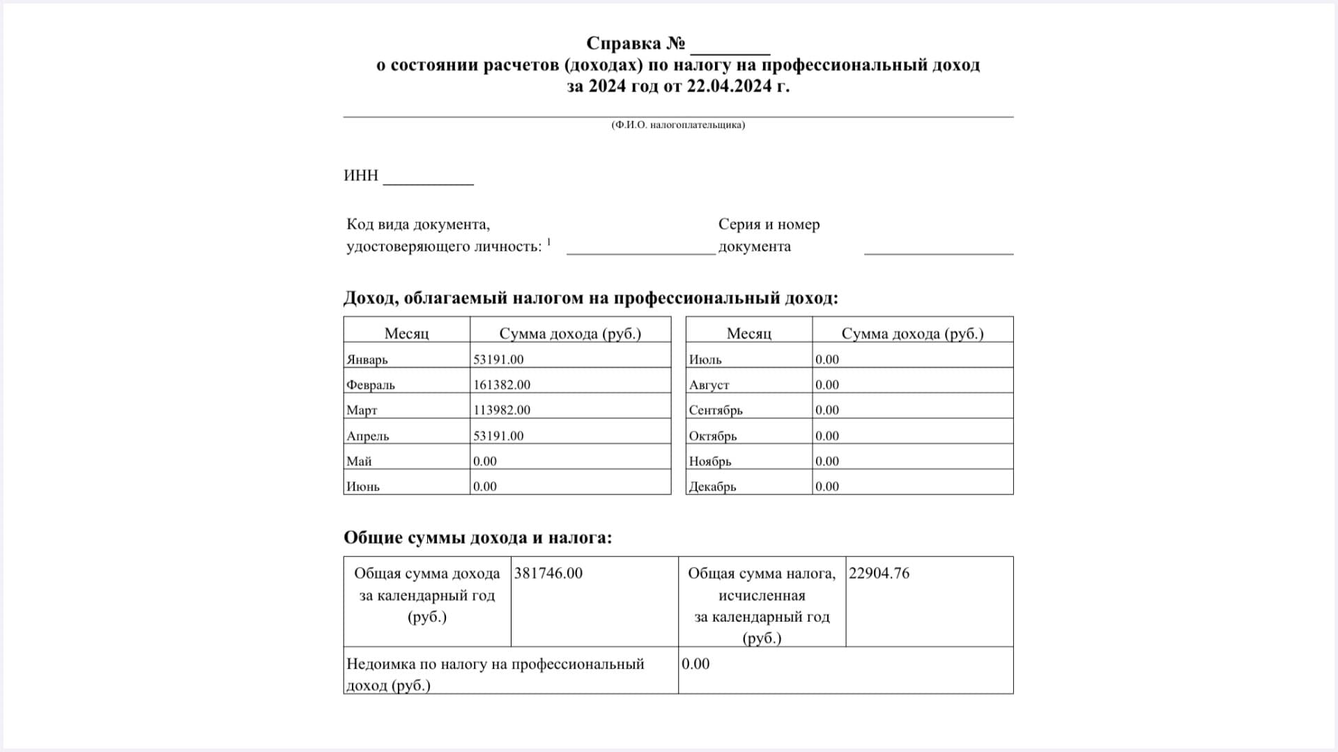Чтобы самозанятому подтвердить доходы, за которые он отчитался, достаточно заказать в личном кабинете справку по форме КНД 1122036. Справка придёт в электронном виде, при необходимости её можно переслать в банк или распечатать.