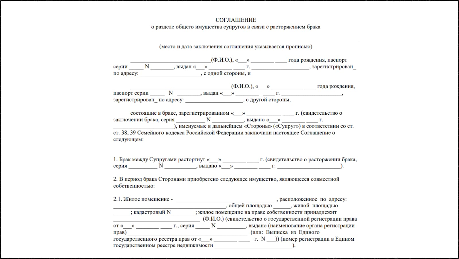Если супруги решили все вопросы мирно, муж подписывает добровольное соглашение — документ о разделе совместной собственности. Оформляет его нотариус. Выглядит это так: