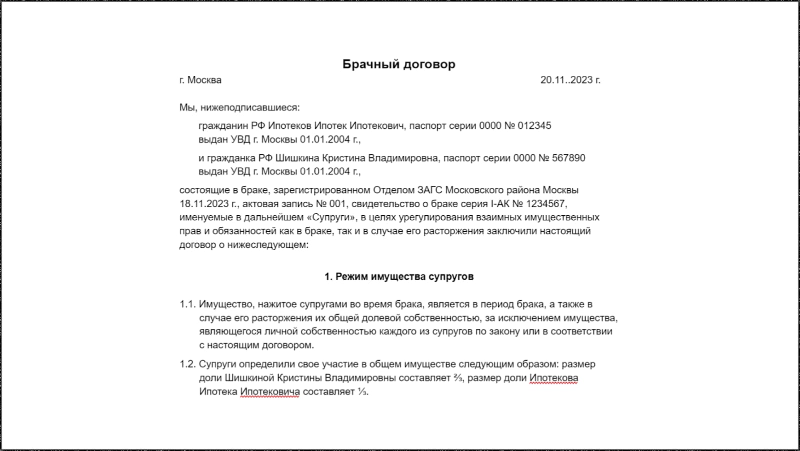 Составить документ поможет юрист по недвижимости или семейным делам, а заверить — нотариус. Брачный договор вступит в силу в день государственной регистрации. Выглядит он так: