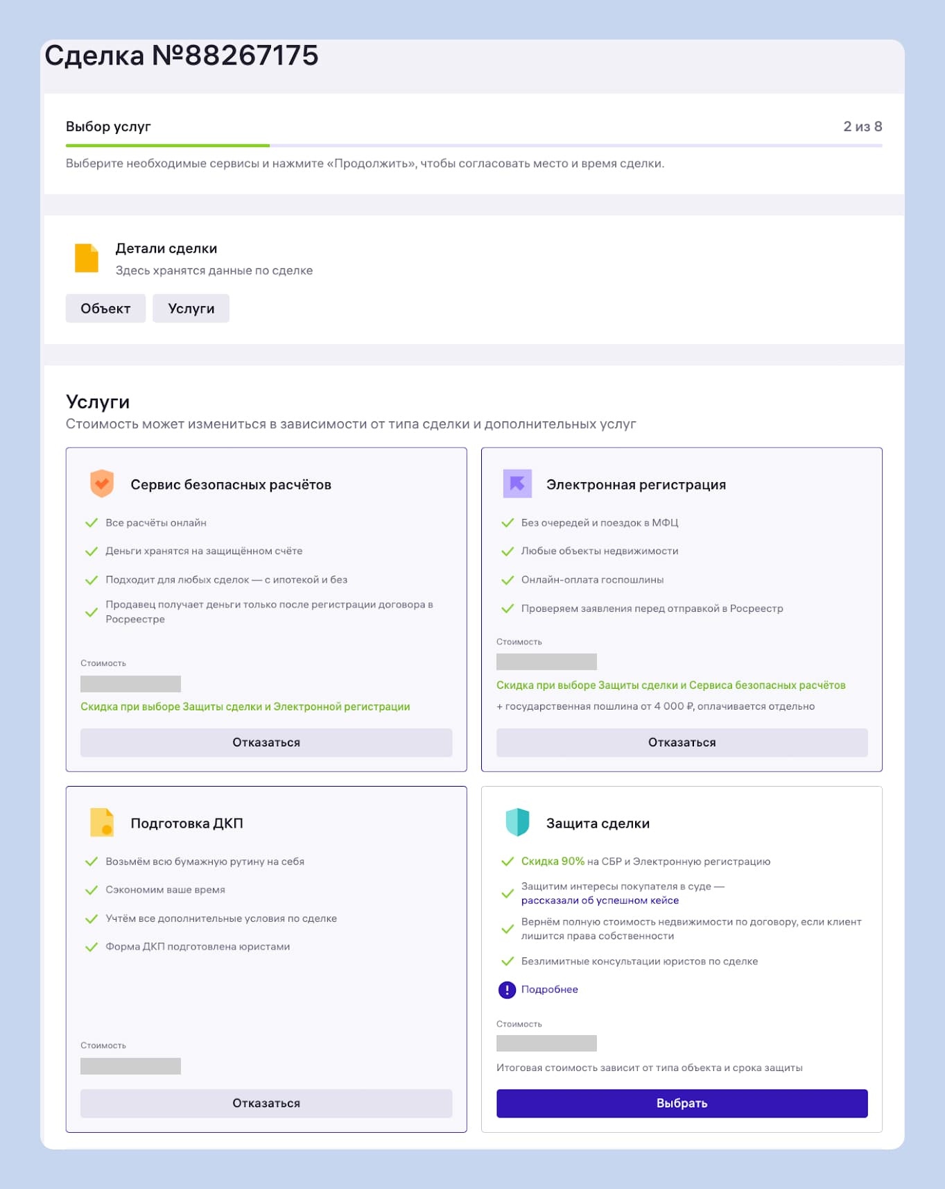 По желанию можно добавить ещё две услуги: подготовку договора купли-продажи и Защиту сделки. Это будет чуть дороже, зато вы сможете сэкономить время и уберечь себя от возможных сложностей. В комплексе услуги стоят меньше, чем по отдельности, так что добавлять Защиту выгодно.