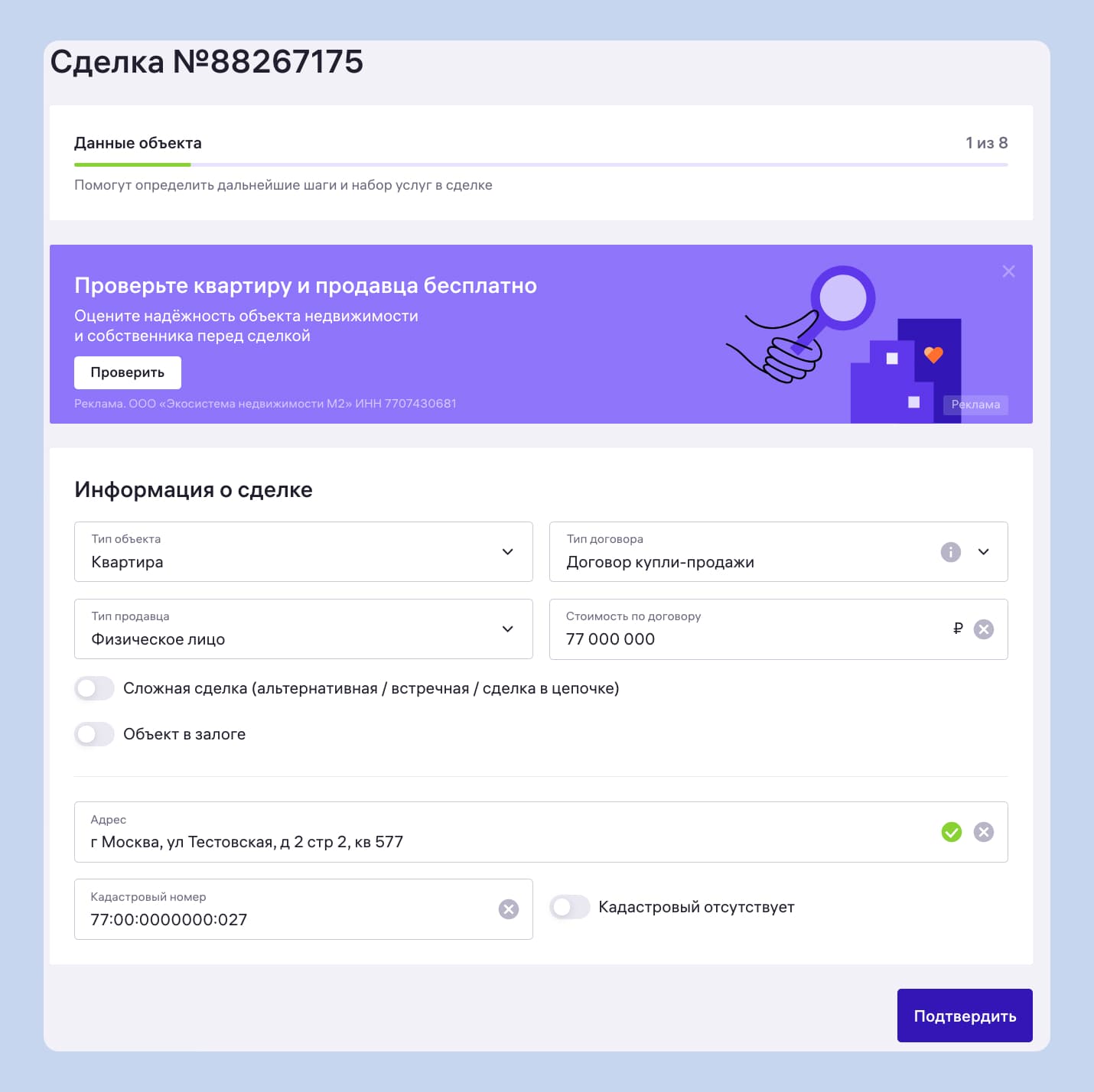 Если вы проводите встречную сделку, она же цепочка или альтернативная сделка, либо квартира находится в залоге — поставьте соответствующие галочки. Ещё понадобится указать адрес и кадастровый номер объекта.