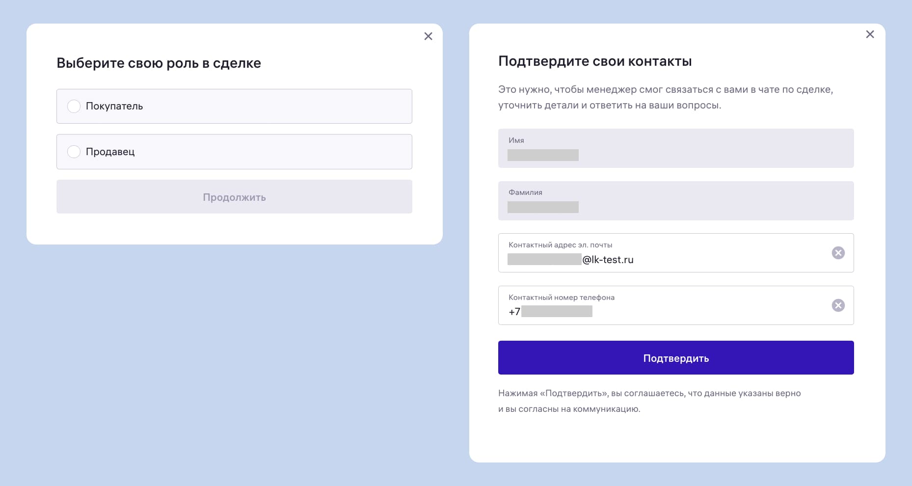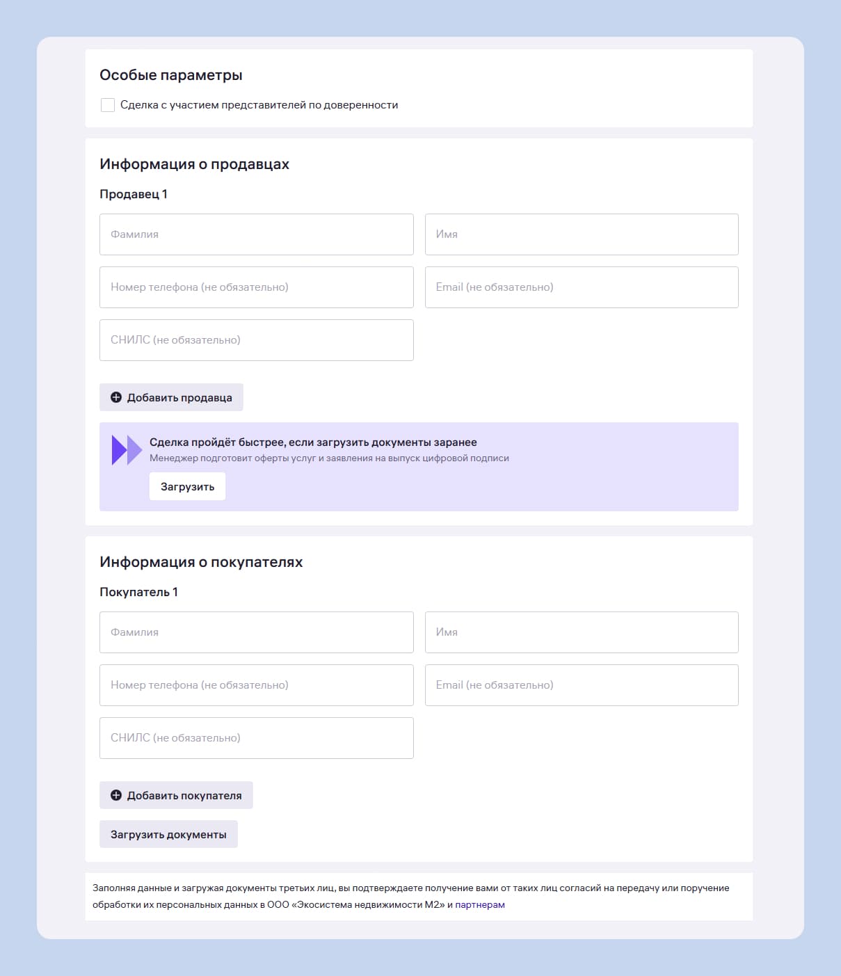 Ещё понадобится указать, кто вы — покупатель, продавец или риелтор. А потом заполнить сведения о себе, чтобы получать уведомления о ходе сделки.