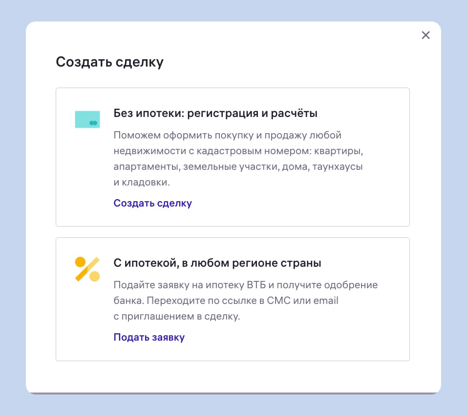 Эта статья посвящена сервису «Сделка». Без дополнительных опций его используют, чтобы продать или купить недвижимость на вторичке без ипотеки. Но можно комбинировать его с другими услугами: Защитой сделки или Ипотекой.
