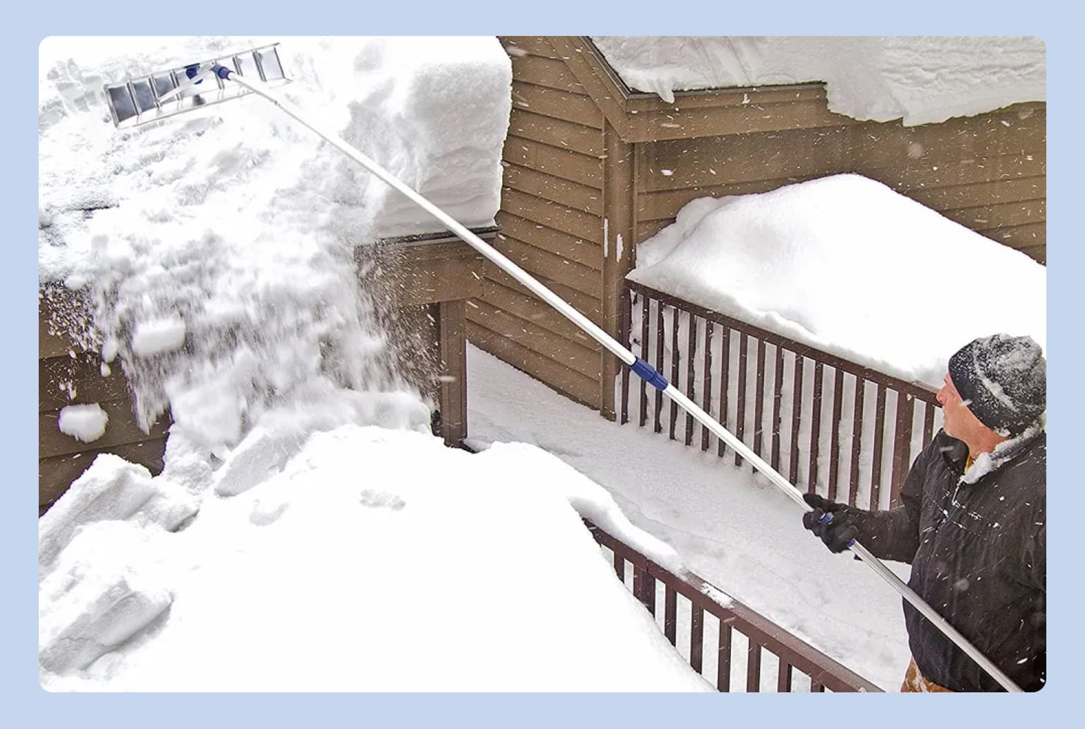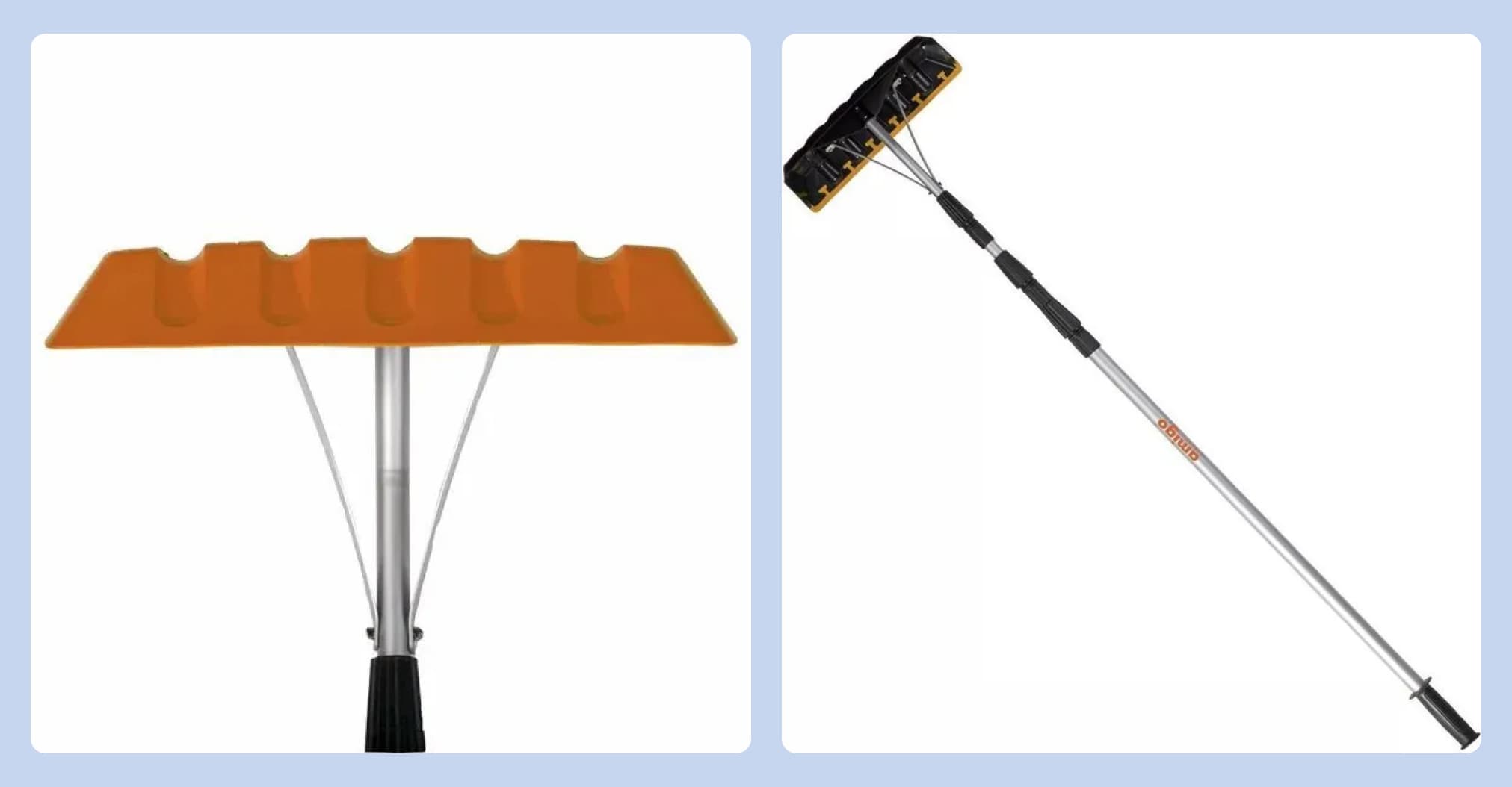 Инструменты выглядят как Т-образные скребки на телескопической ручке: они позволяют не залезать на крышу, а делать всё, стоя на земле. У некоторых в комплекте идёт сменная насадка с острым краем — специально для сосулек.