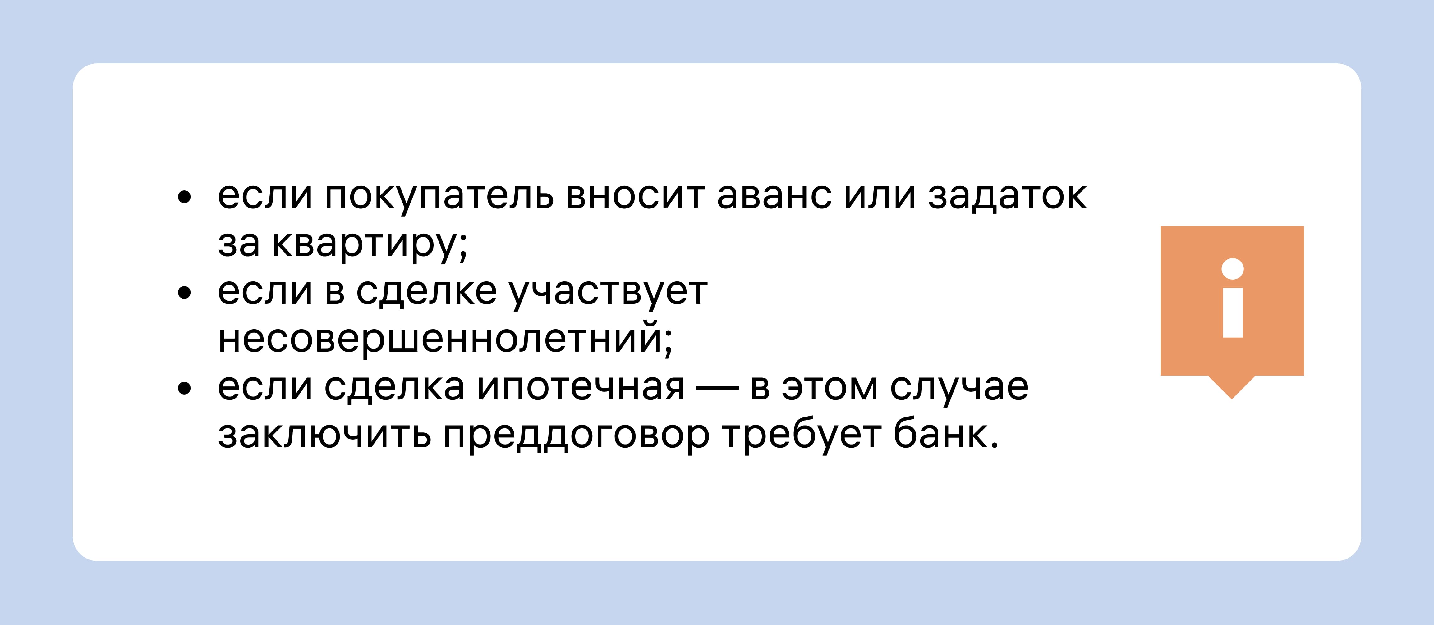 Преддоговор нужен, чтобы показать: намерения сторон серьёзны. Так продавец или покупатель с меньшей вероятностью сможет в последний момент отказаться от сделки без весомых причин. Поэтому ПДКП, как правило, требуют: