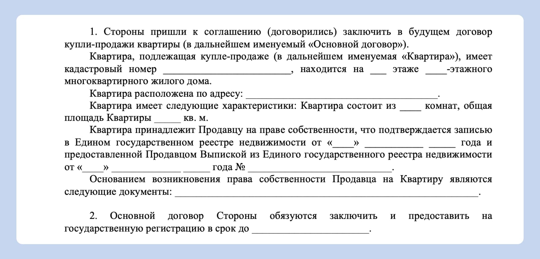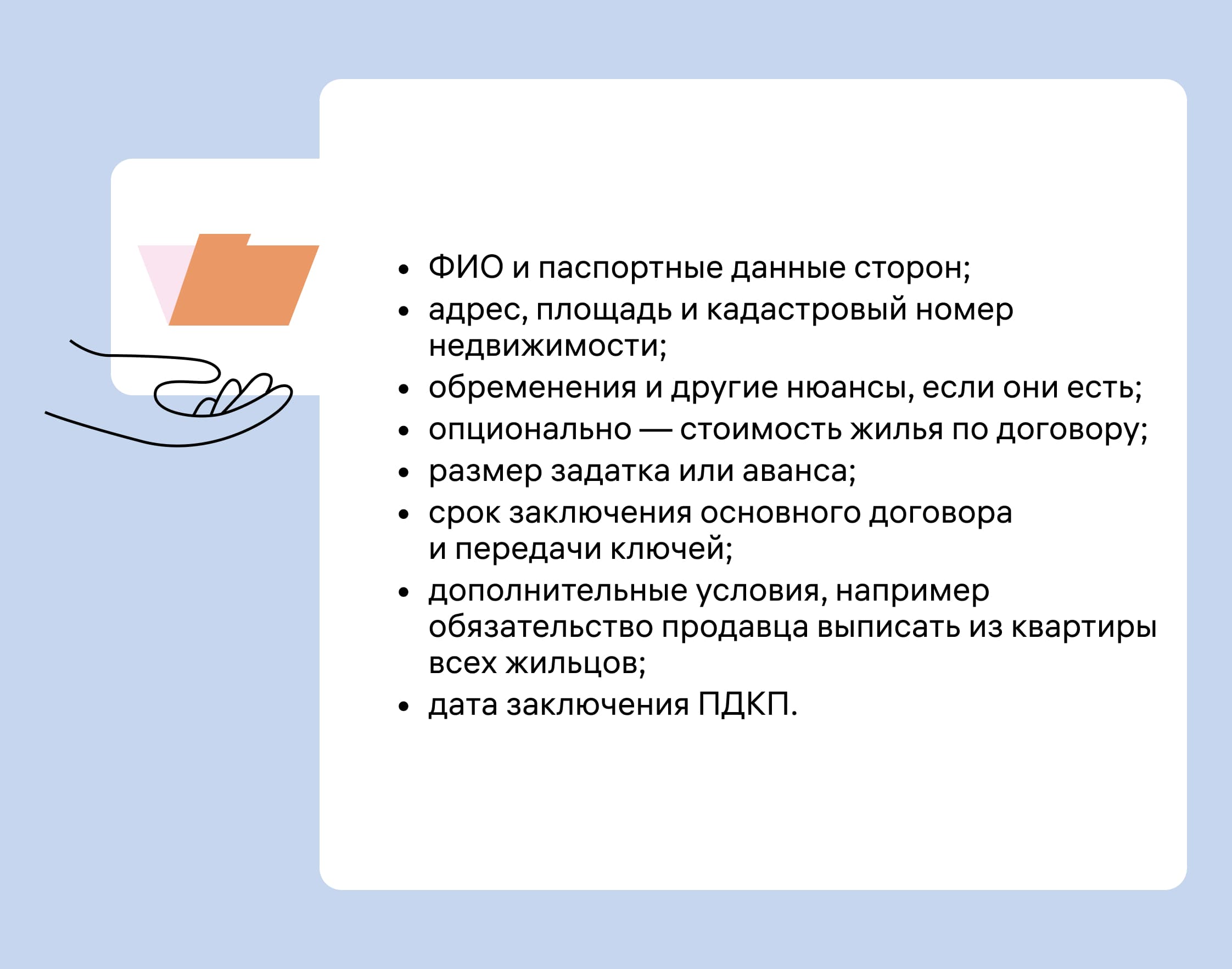 Обычно наполнение преддоговора похоже на основной ДКП. Там указывают предмет сделки, прописывают сроки и ответственность за их несоблюдение. Рассказываем подробнее о том, что должно входить в такой договор и какие детали в нём стоит учесть.