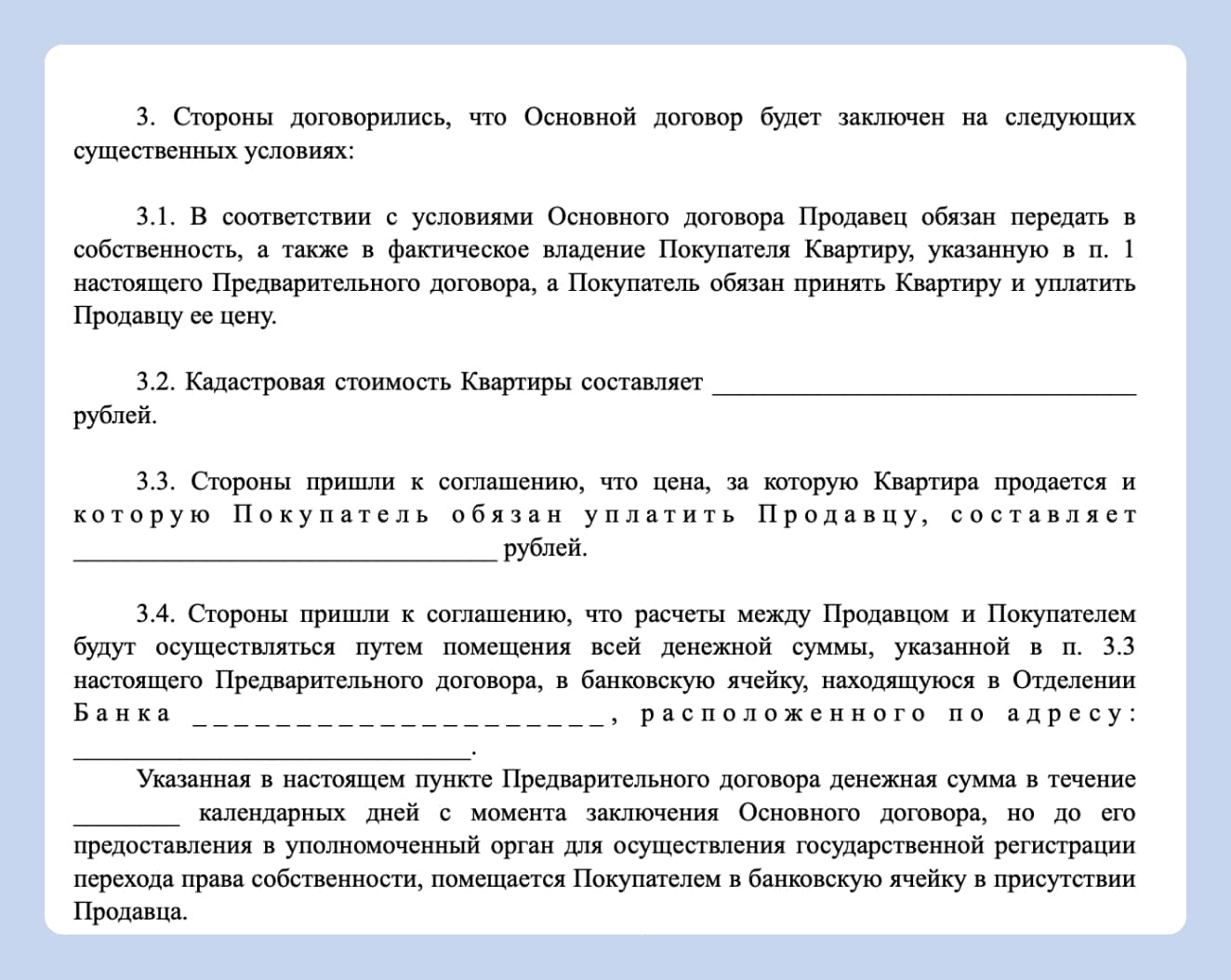 Остальные условия преддоговора считаются факультативными. Даже если их не указать, документ будет иметь силу. Но обычно их всё-таки прописывают: так безопаснее для обеих сторон. Получается, что ПДКП почти дублирует сведения из основного договора купли-продажи.