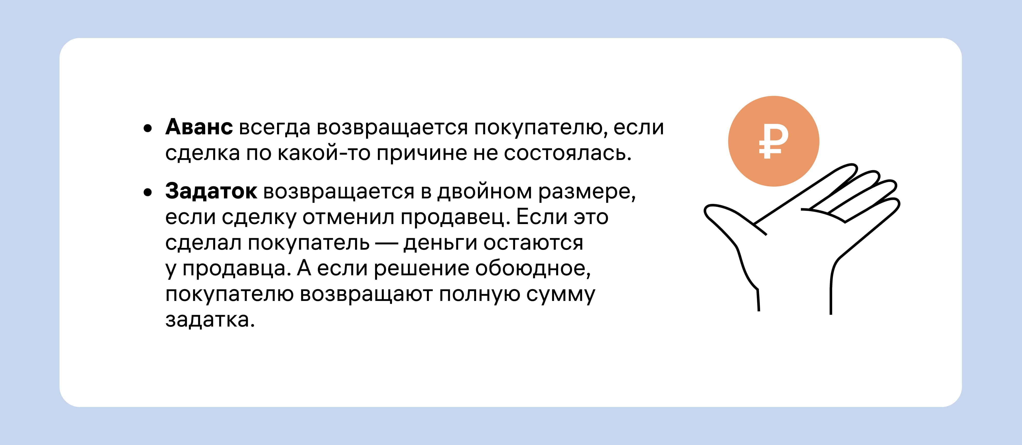 Возврат аванса или задатка. Их возвращают по общим правилам, если в договоре или соглашении не указано иное. Кроме того, в ПДКП можно прописать неустойку за нарушение условий — если она есть, придётся выплатить и её.