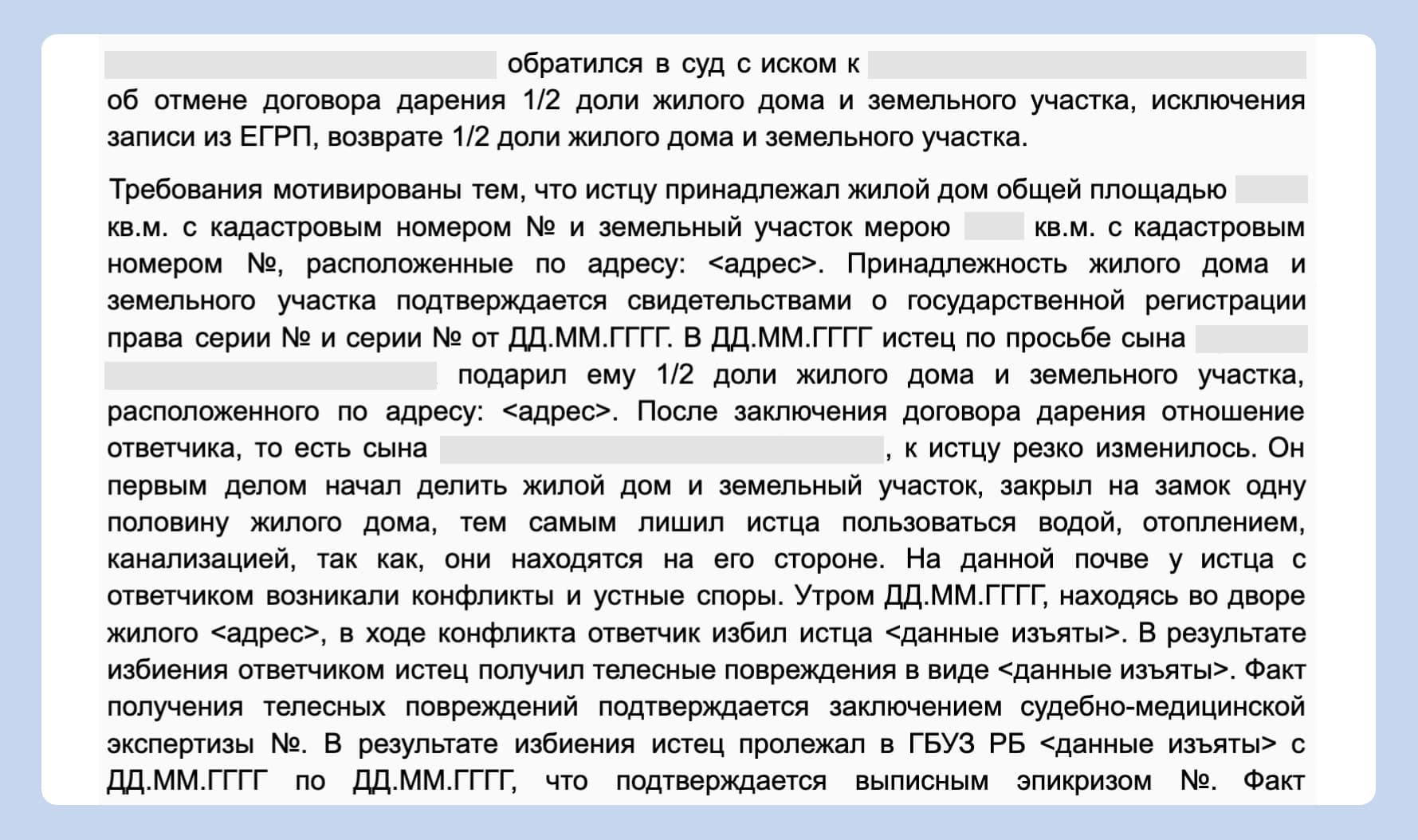- Выбрал неверное основание для иска — например, говорил о недееспособности дарителя, хотя тот в здравом уме.
