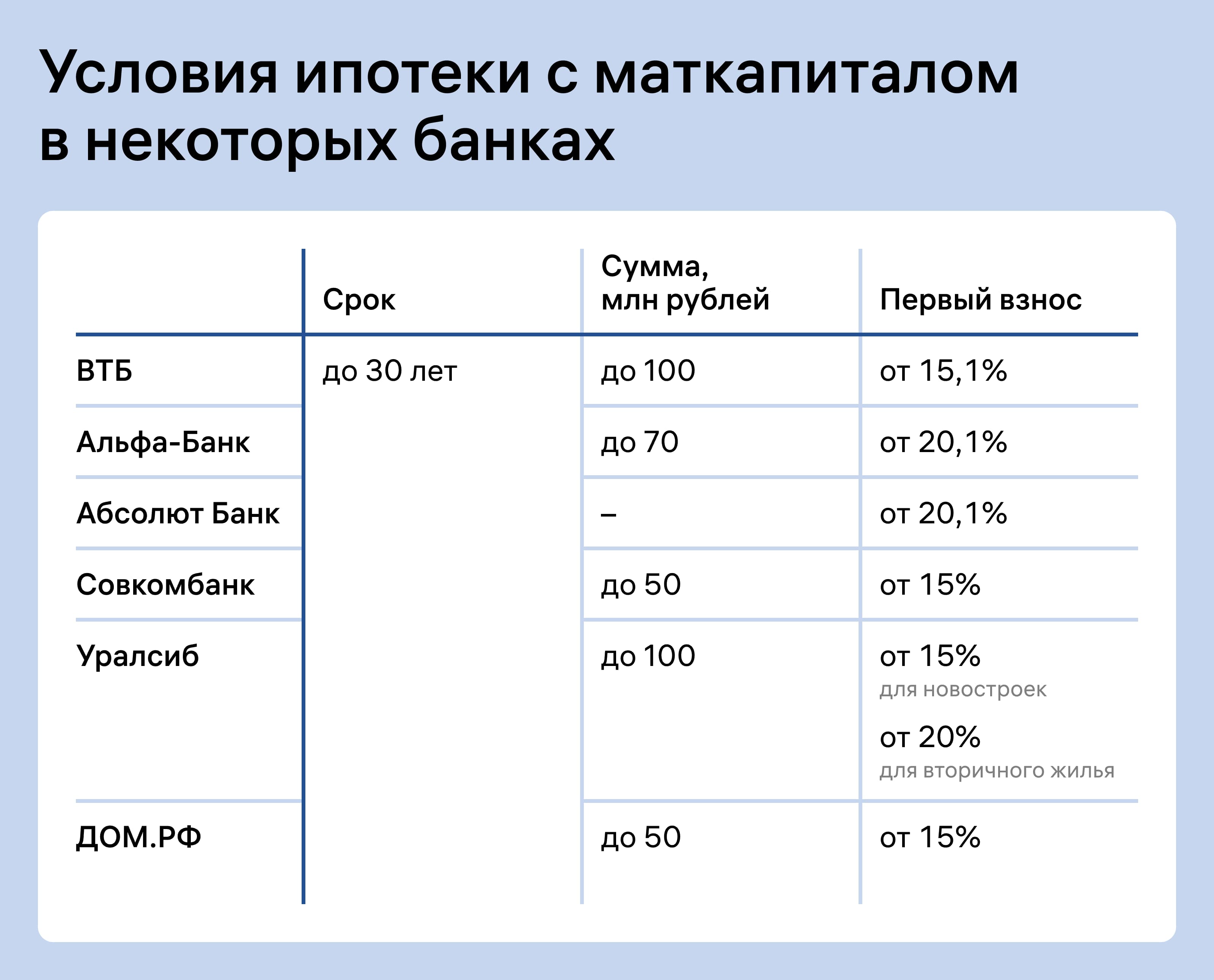 Первоначальный взнос обычно составляет от 10 до 30% от стоимости недвижимости. Даже если маткапитала достаточно, банк может попросить внести часть суммы собственными накоплениями, чтобы убедиться в платёжеспособности заёмщика.