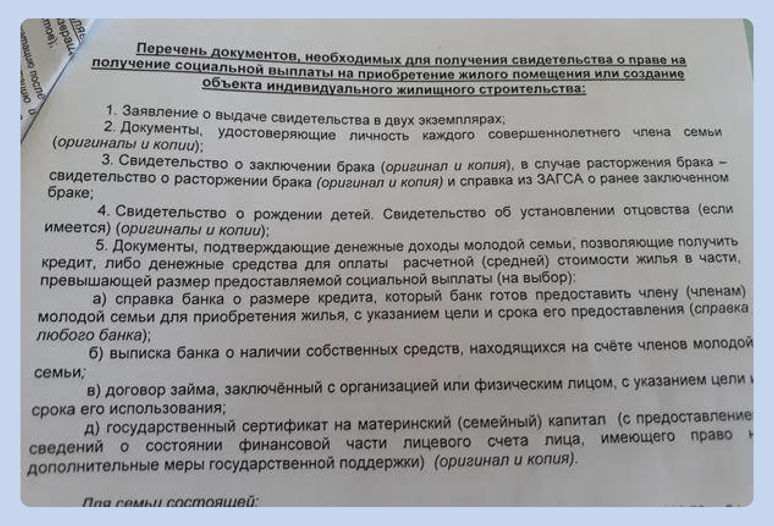 - Собрать документы. Минимальный набор бумаг мы описали ниже. Но сперва стоит уточнить правила по вашей области: список может различаться в зависимости от того, где вы живёте. Свидетельство, что семья нуждается в жилье, — один из обязательных документов.