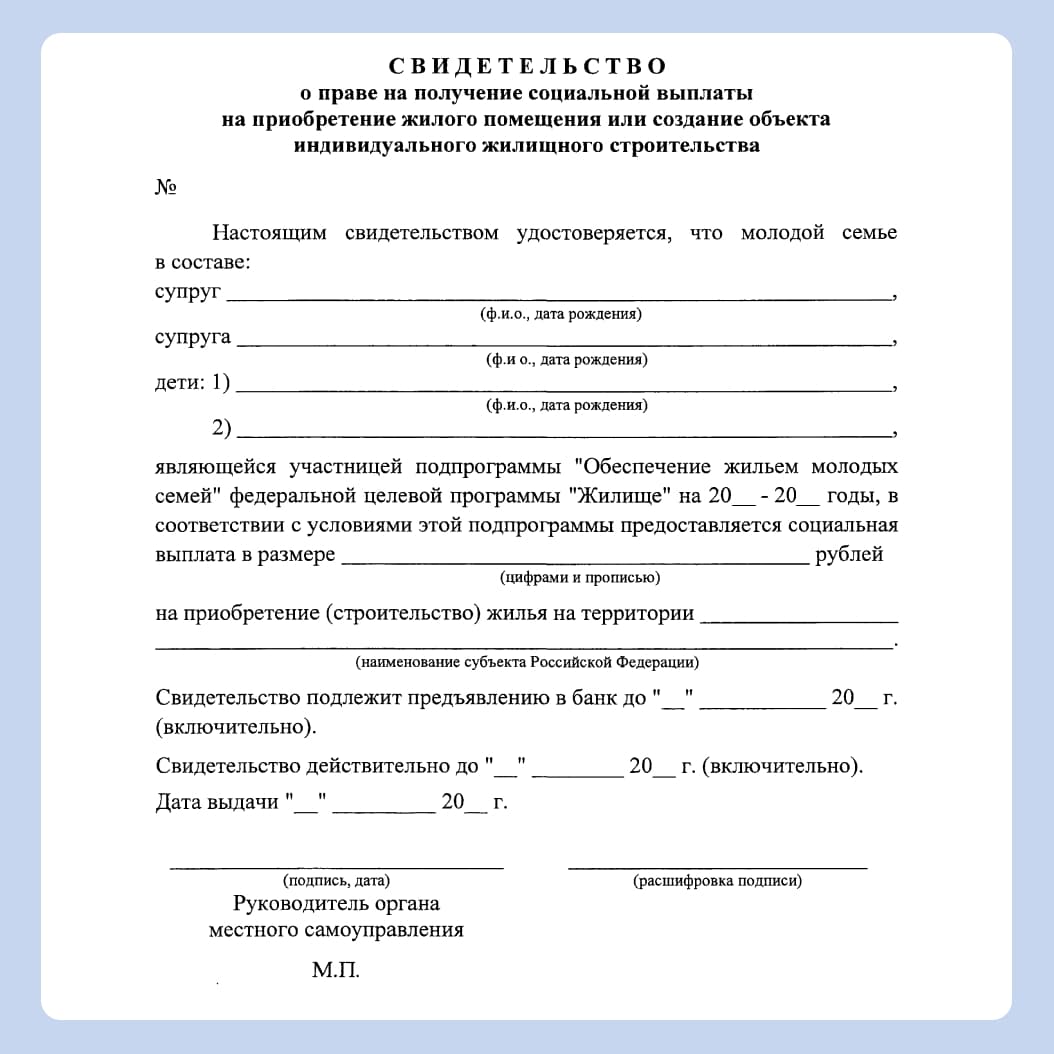 - Оформить свидетельство. Когда очередь подойдёт, семье сообщат об этом. Тогда нужно будет снова предоставить в администрацию тот же пакет документов и получить свидетельство о праве на выплату. Оно действует 7 месяцев.