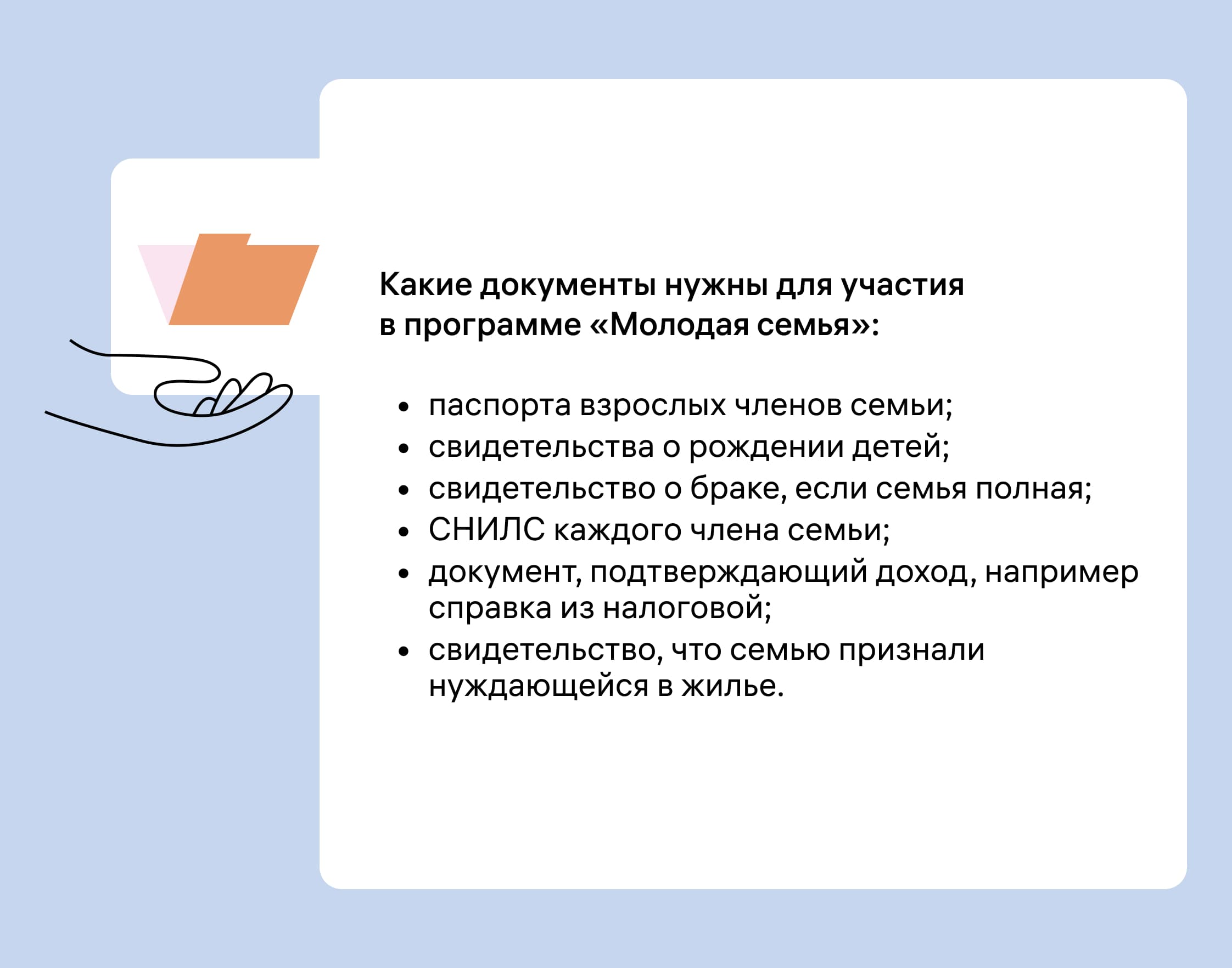 Этот список не исчерпывающий. В разных регионах могут требовать и другие документы — зависит от того, как там реализовали программу. Но перечисленные здесь документы понадобятся везде, вне зависимости от города или области.