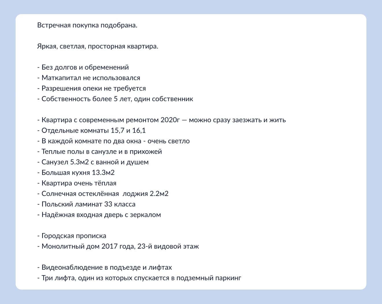 Текст. Он должен быть структурированным и информативным — содержать всю важную информацию о квартире. Конкретика важнее всего: если её не будет, покупатели, скорее всего, пройдут мимо. Вот как сделать текст полезным и цепляющим для читателя объявления: