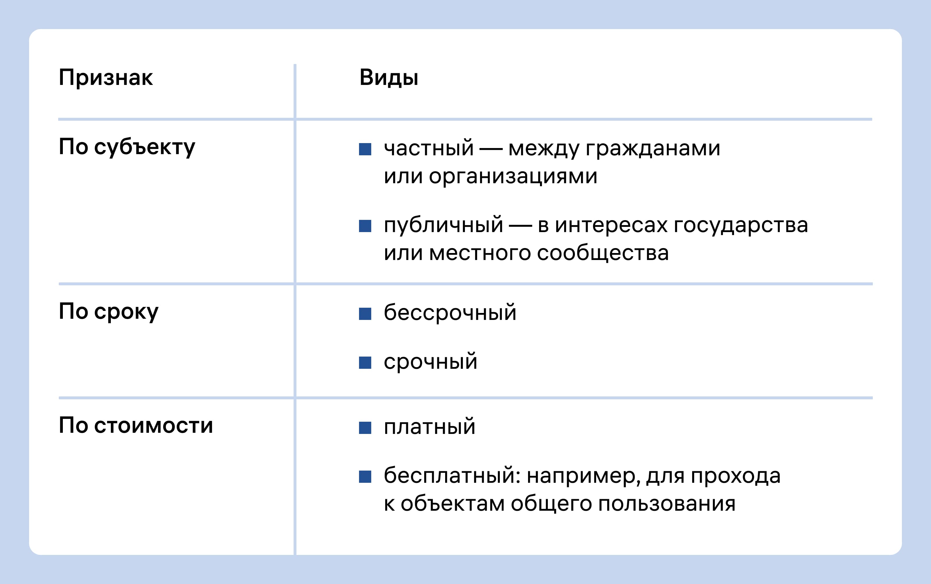 Частный — между конкретными лицами, например соседями. Публичный — устанавливается государством в интересах всех граждан, например для прохода к водоёму.