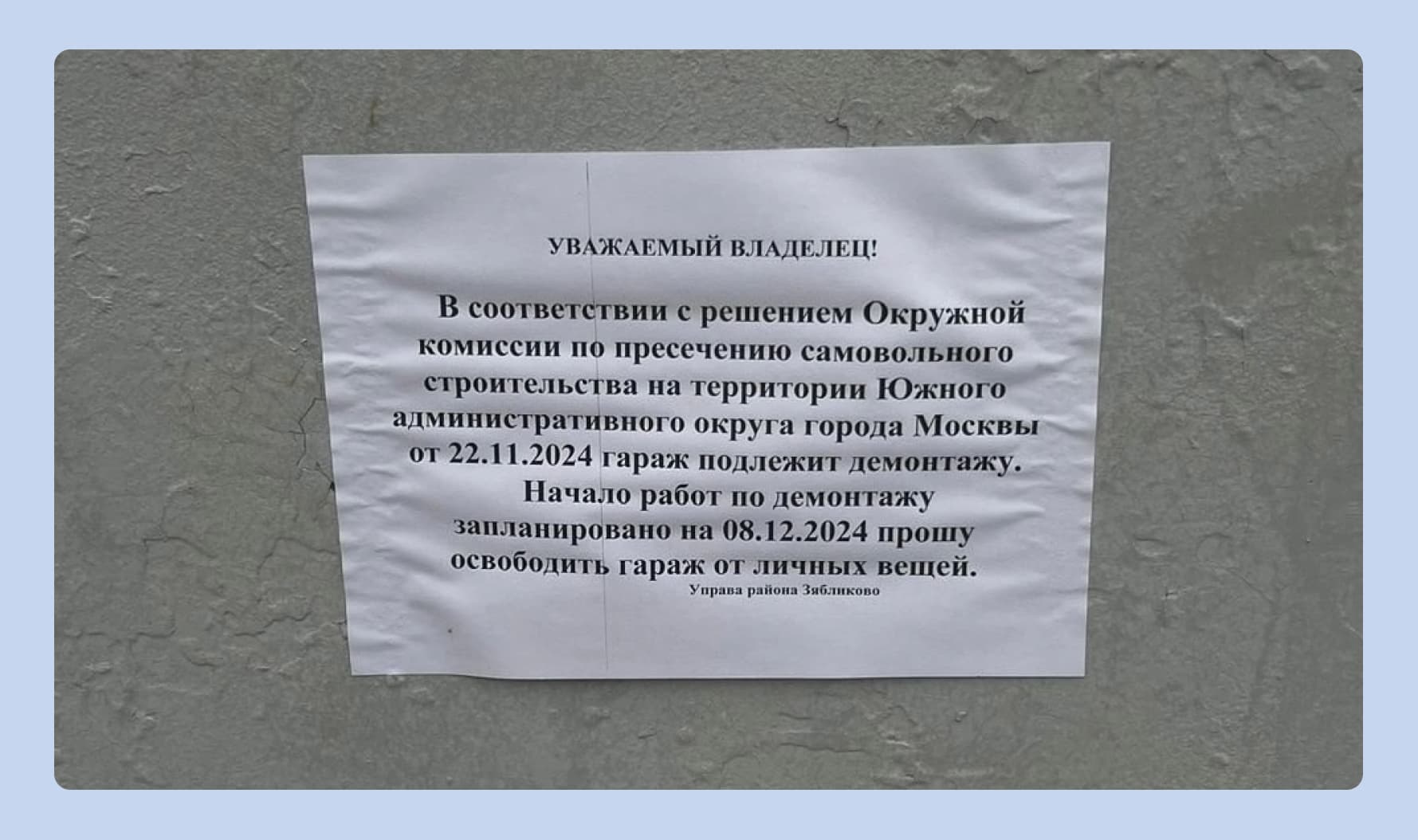 Так может выглядеть уведомление о будущем демонтаже. Источник