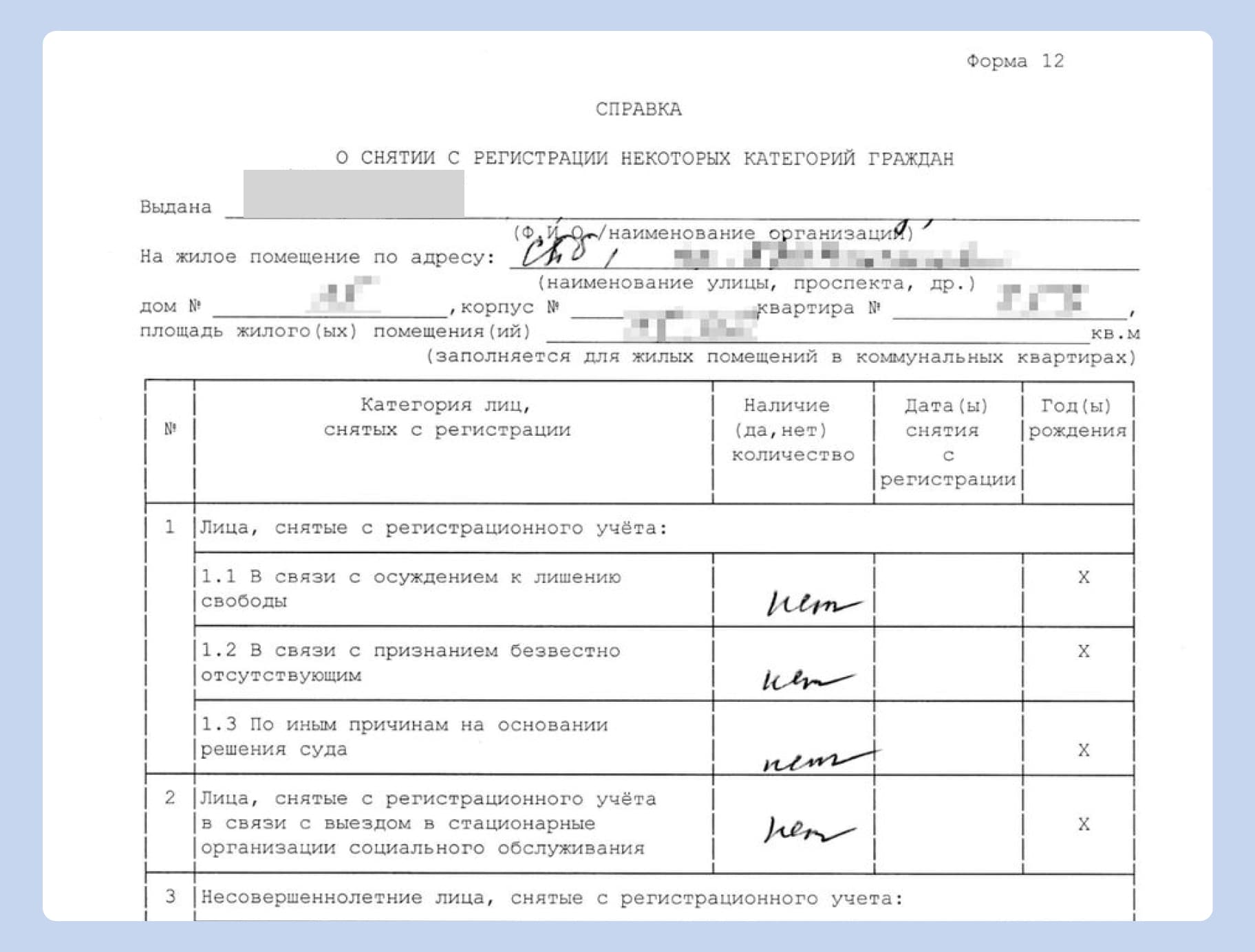 Сам документ выглядит как таблица. Слева перечислены категории людей, которых могли бы снять с регистрации, а справа — информация о них. Если таких жильцов в квартире не было, там будет стоять слово «Нет», прочерк или крестик.
