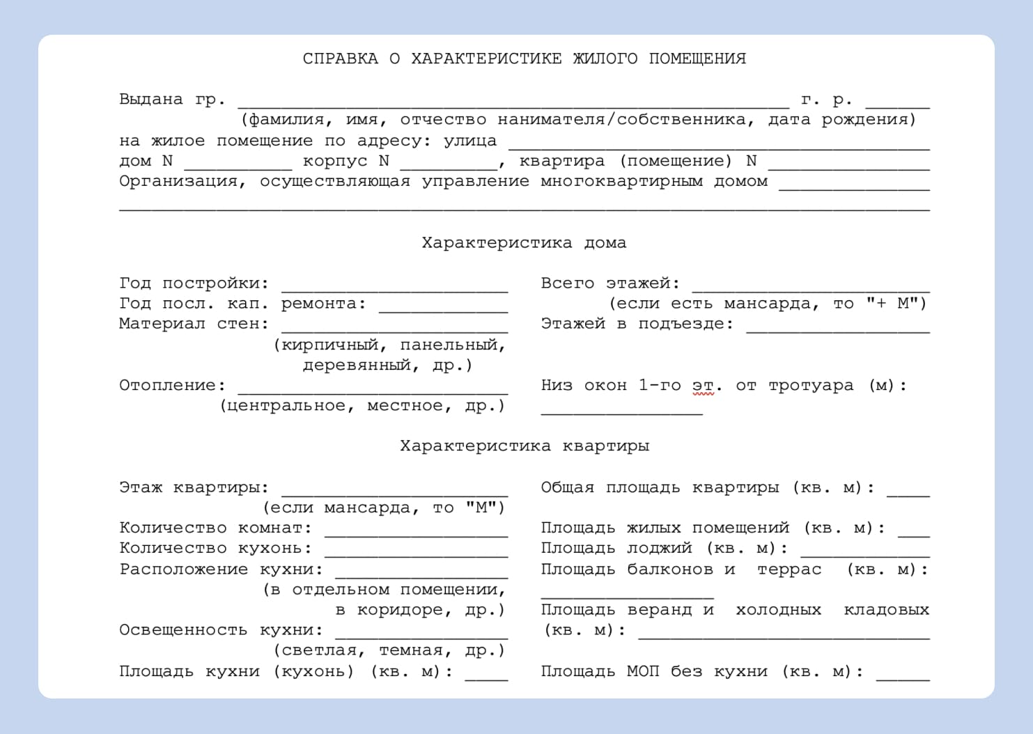 Эта справка называется «Характеристика жилого помещения». В ней собрана информация о свойствах самого объекта. Например, сколько этажей в доме, из какого материала сделаны стены, какой метраж у квартиры.