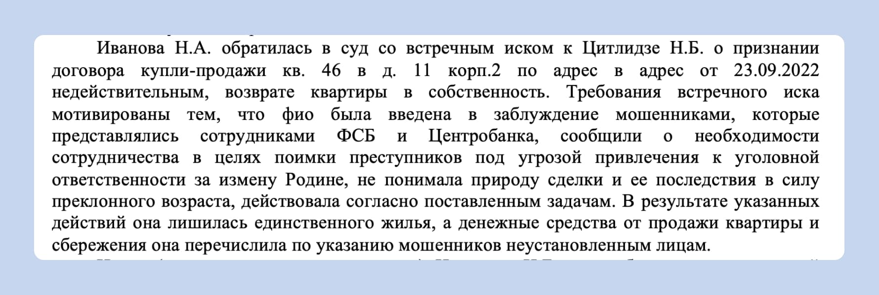 Сейчас судебная практика изменилась. Особенно резонансным стало дело Ларисы Долиной, которая продала жильё под влиянием мошенников. Несмотря на то что в высших инстанциях решение по её ситуации пересмотрели, суды стали чаще вставать на сторону продавца.