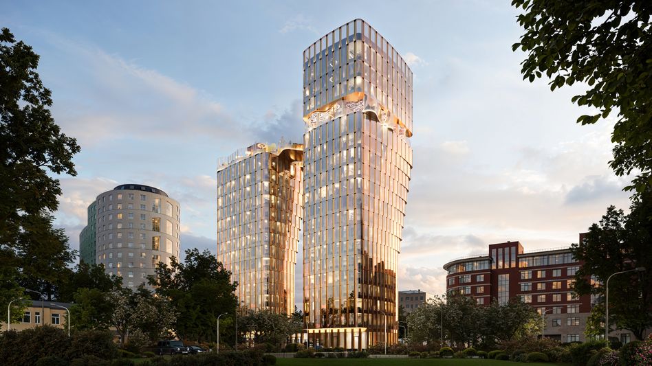 АРХИТЕКТУРА, СОЗДАННАЯ ВОСХИЩАТЬ. Два элегантных корпуса высотой 15 и 19 этажей объединяет парящий мост-сад на уровне 16-го этажа, создающий редкий для центра столицы архитектурный образ. Авторский почерк бюро узнается в каждой линии.
