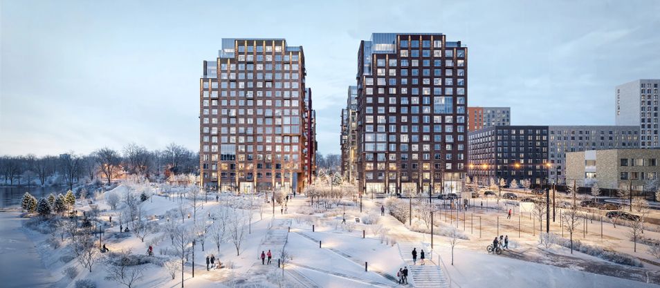 Архитекторы бюро «KK ARCHSTUDIO» вдохновились локацией проекта. Природные оттенки и активная пластика корпусов напоминают рельефные выступы на берегу, а окна отражают водную гладь, визуально объединяя дома с природой.