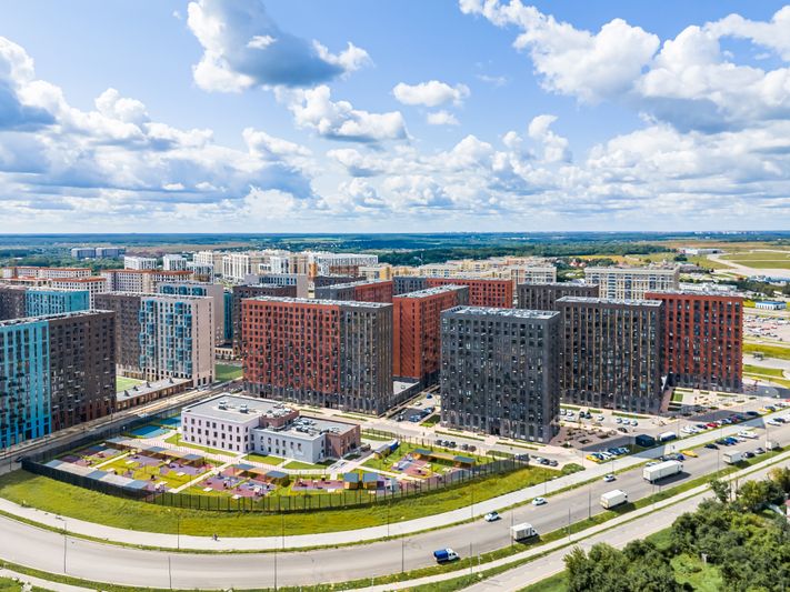 В квартале — монолитные дома комфортной высоты, от 10 этажей. Светлые фасады украшают кирпичные вставки в теплых природных оттенках. Список доступных планировок обширен — от студий до трехкомнатных квартир, в том числе с двумя санузлами. В квартирах на последнем этаже — потолки высотой 3 метра. Все балконы — с панорамным остеклением.