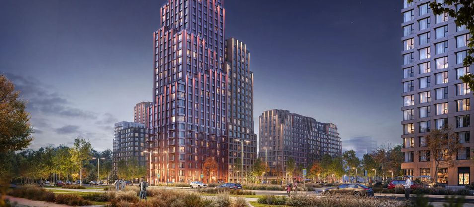 Дизайн проработан и внутри домов. На первых этажах — просторные и светлые лобби: мягкие тона выразительно дополнят контрастные чёрные и терракотовые акценты, а стеклянные двери дарят пространству много естественного света и ощущение простора.