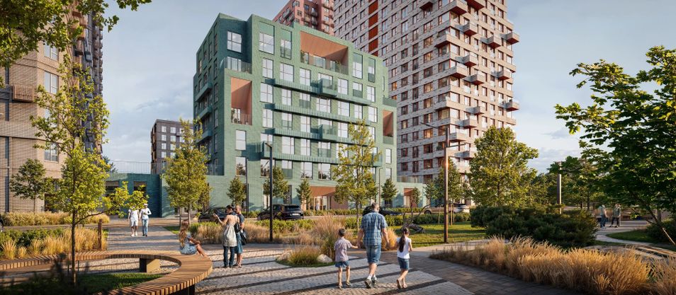 В проекте жилые дома высотой от 7 до 32 этажей, детский сад и школа. На первых этажах доступны магазины, кафе, салоны красоты и другие сервисы — чтобы купить кофе и свежий хлеб к завтраку, можно просто спуститься на лифте.