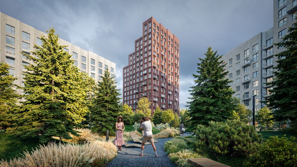 Архитектура квартала навеяна северной природой: разновысотные здания повторяют живописные линии северных скал и высоких хвойных деревьев. Это отражено и в колористике — фасады окрашены в цвета серого гранита, сосновой коры и серебристой глади воды.