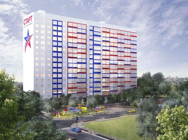 ЖК «Старт» располагается в городе Самара. Здания выполнены в современном лаконичном стиле – прямые монолитные постройки окрашены в бело-голубые цвета, присутствуют красные и синие вставки.